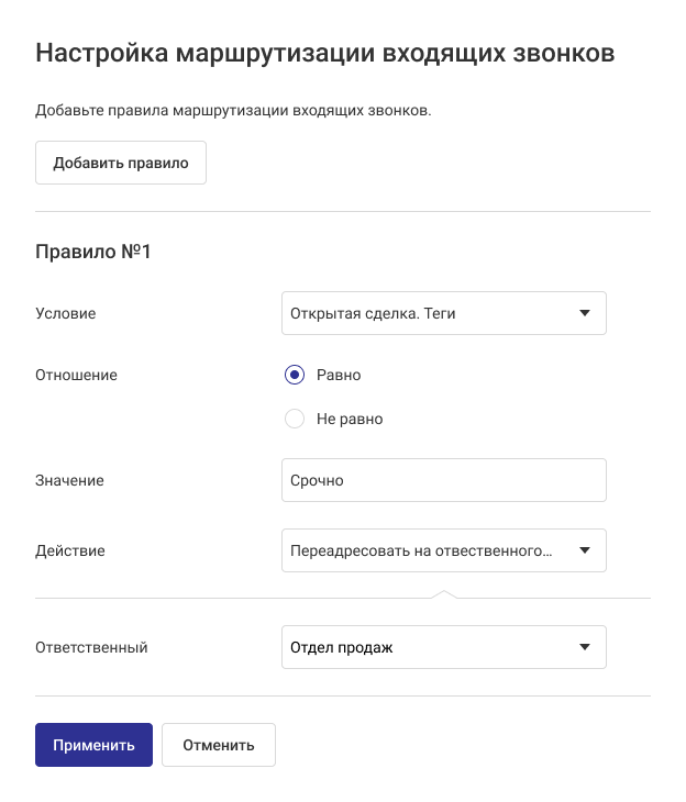 Умная маршрутизация автоматически направляет входящий звонок нужному сотруднику или отделу, используя теги из карточки клиента, компании или сделки, а также учитывает рабочее время. Вы можете гибко настроить маршрутизацию под свои задачи.