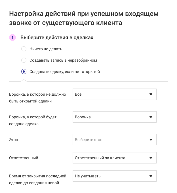 Иногда клиенты перезванивают после закрытия сделки в amoCRM — например, для уточнения деталей о заказе. По умолчанию после таких звонков появляются новые ненужные сделки.