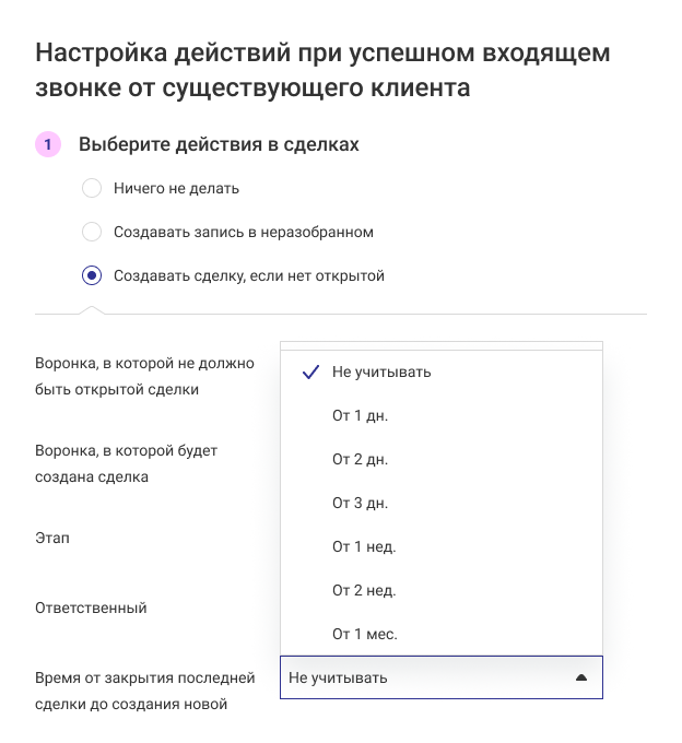 Чтобы не удалять дубли вручную, настройте период ожидания после закрытия сделки — если в это время позвонит тот же клиент, то дубль не появится в CRM.
