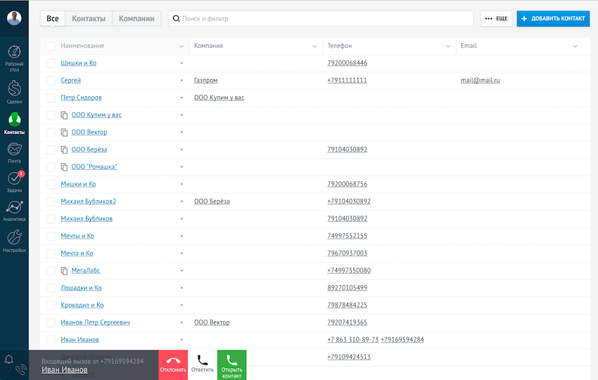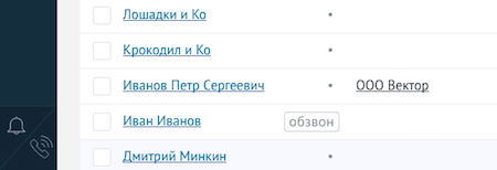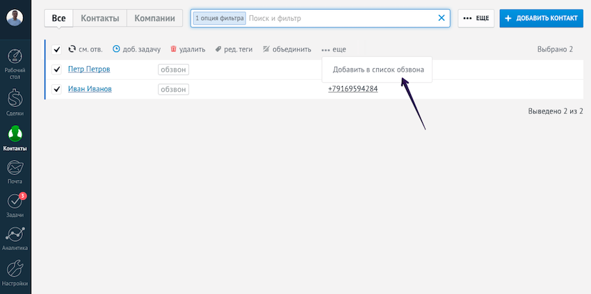 Новая и очень удобная функция для менеджеров, которым необходимо прозвонить базу клиентов. Выберите несколько контактов, нажмите «Еще» и «Добавить в список обзвона»: