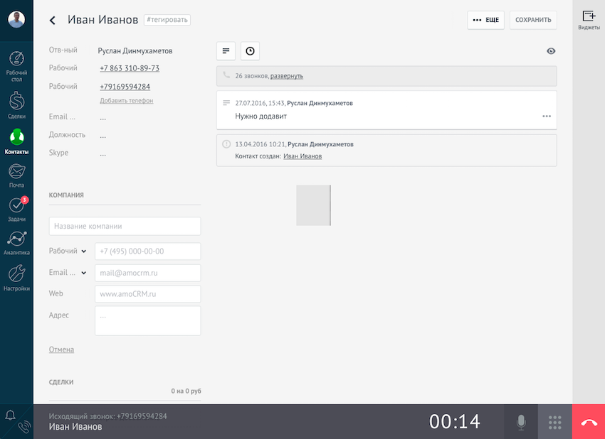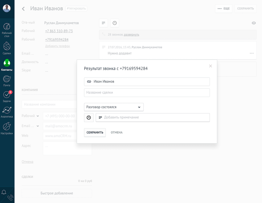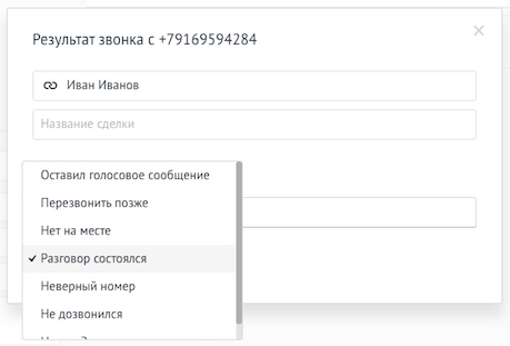 По завершении разговора менеджер может создать сделку, вбить результаты разговора, а также создать следующую задачу по данному клиенту.