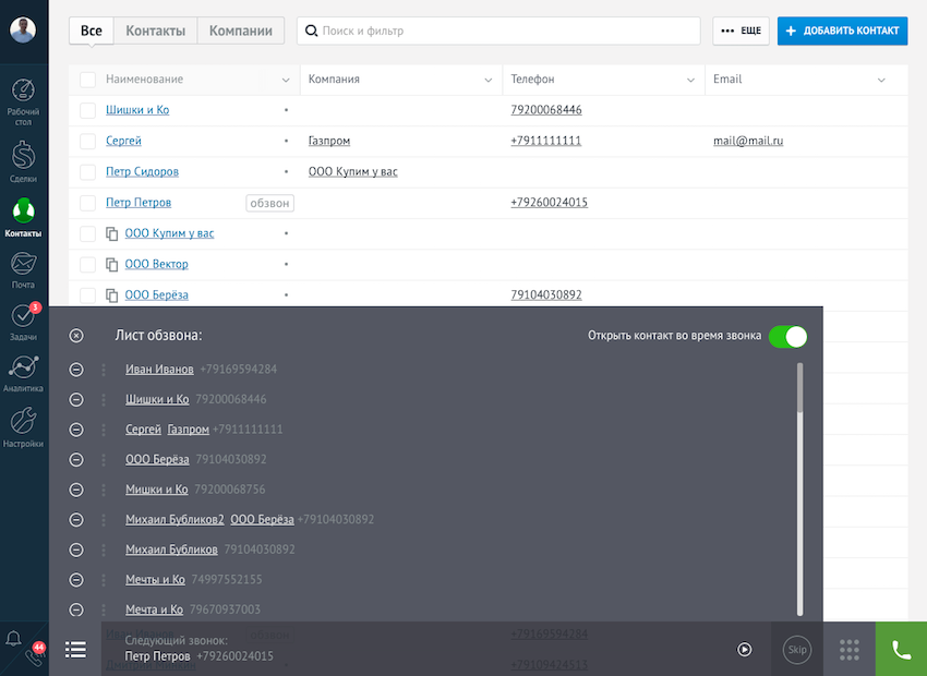 Перед каждым звонком менеджеру дается таймер в 10 секунд, чтобы отдышаться (можно позвонить сразу, если нажать на зеленую трубку). Менеджер может поставить обзвон паузу или пропустить следующий контакт (Skip). На иконке трубки в левом нижнем углу отображается количество контактов, которое осталось прозвонить. При каждом наборе можно автоматически открывать карточку клиента, чтобы увидеть его данные.
