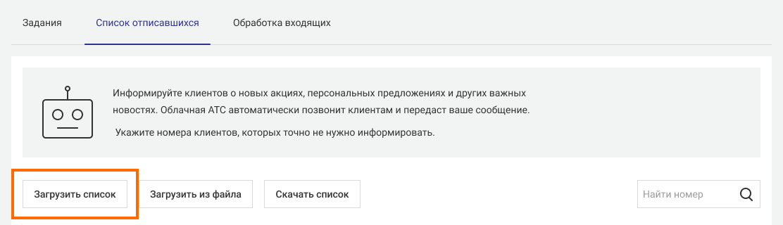Чтобы загрузить список номеров из файла в форматах .csv, .xls и .xlsx, на вкладке «Список отписавшихся» нажмите кнопку «Загрузить из файла».
