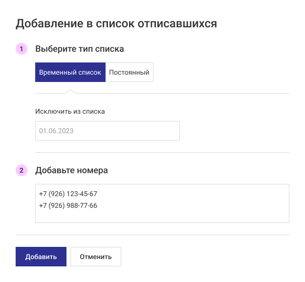 Выберите, как долго номера должны находиться в списке исключений (временно или постоянно), и введите один или несколько номеров в формате 7ХХХХХХХХХХ.
