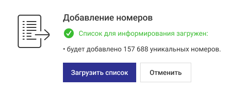 10. Загрузите список номеров клиентов для автоинформирования в форматах .csv, .xls или .xlsx. Формат номеров – 7ХХХХХХХХХХ.