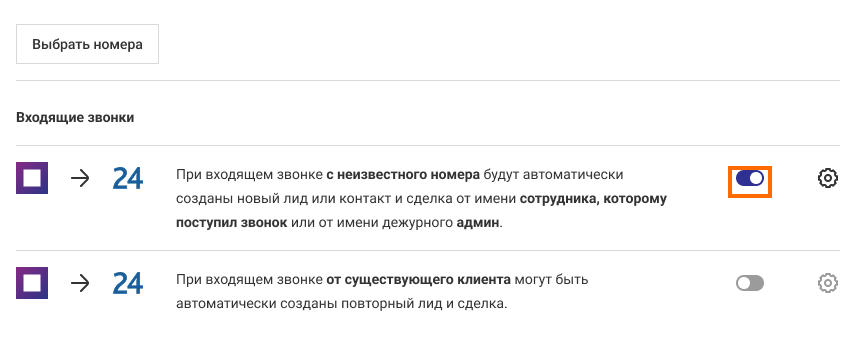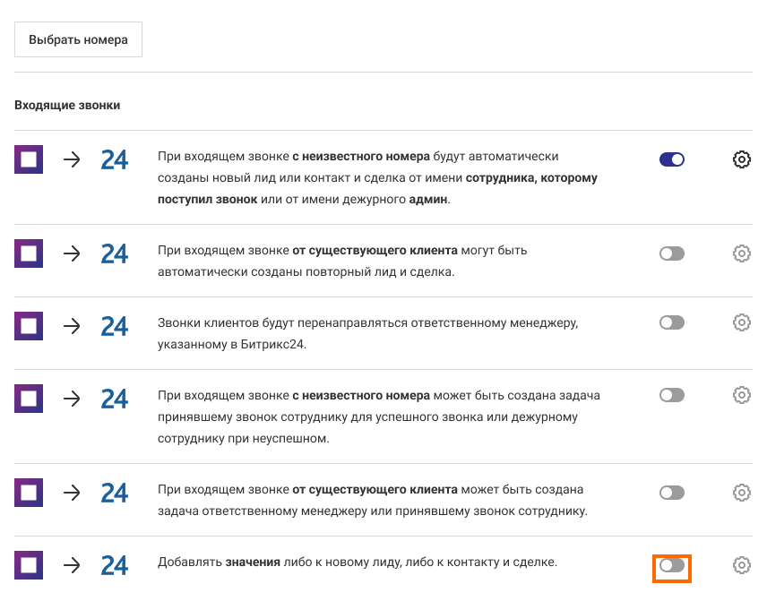 1. В интерфейсе АТС перейдите в: «Настройки» — «Интеграция с CRM» — «Интеграция с Битрикс24» — сценарии интеграции для входящих звонков. 2. Включите автоматическое создание лидов, контактов и сделок в интерфейсе АТС.