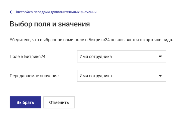4. В выпадающем списке выберите поле в Битрикс24 и данные, которые хотите в него передать. Нажмите «Добавить».
