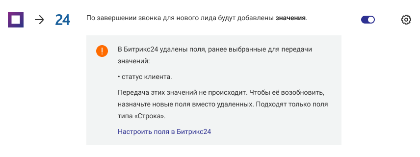 Если в Битрикс24 удалить одно из настроенных пользовательских полей, в списке сценариев интеграции в АТС появится ошибка: