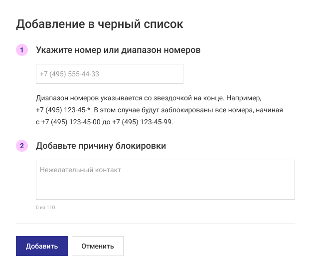 При вводе блокируемых номеров можно применять маску, например: все номера с +7 (701) 220-60-*. При этом будут заблокированы все номера в диапазоне +7 (701) 220-60-00 до +7 (701) 220-60-99.