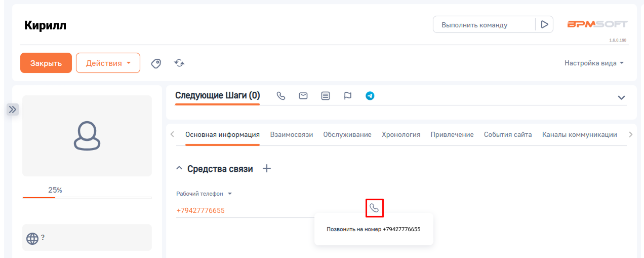 - В карточке контакта в блоке «Средства связи» нажать на иконку трубки.