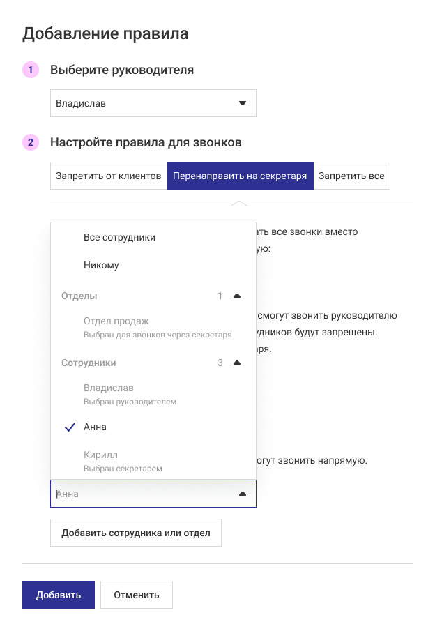 Затем выберите отделы и сотрудников, которые смогут звонить руководителю через секретаря — звонки от остальных сотрудников будут запрещены.