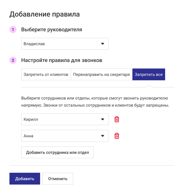 • Запретить всем звонить руководителю, кроме исключений — выбранных сотрудников, которые продолжат звонить руководителю напрямую.