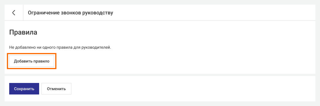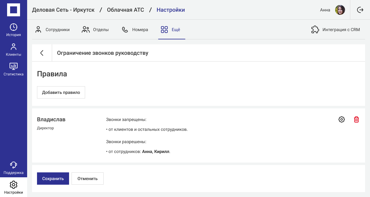 4. Когда настроите правило ограничений звонков, поступающих руководителю, нажмите «Добавить». Проверьте добавленные ограничения — если их нужно отредактировать, нажмите на шестеренку. Если правило станет неактуальным, вы сможете удалить его, нажав на корзину.