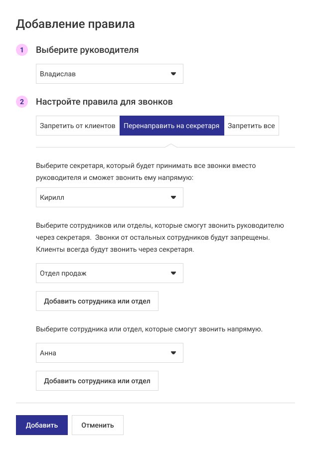 • Перенаправить на секретаря вызовы выбранных сотрудников, а остальные — запретить. Также можно выбрать сотрудников, которые продолжат звонить руководителю напрямую.