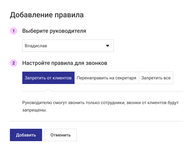 • Запретить от клиентов — руководителю смогут звонить только сотрудники через АТС. Этот вариант выбран по умолчанию.