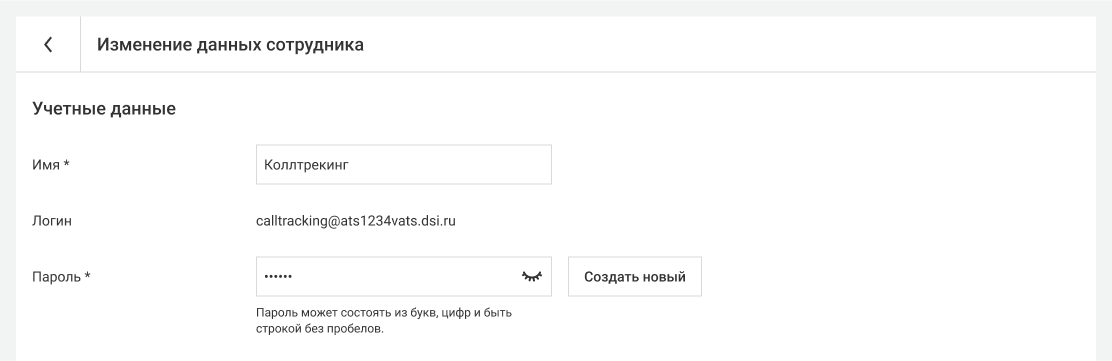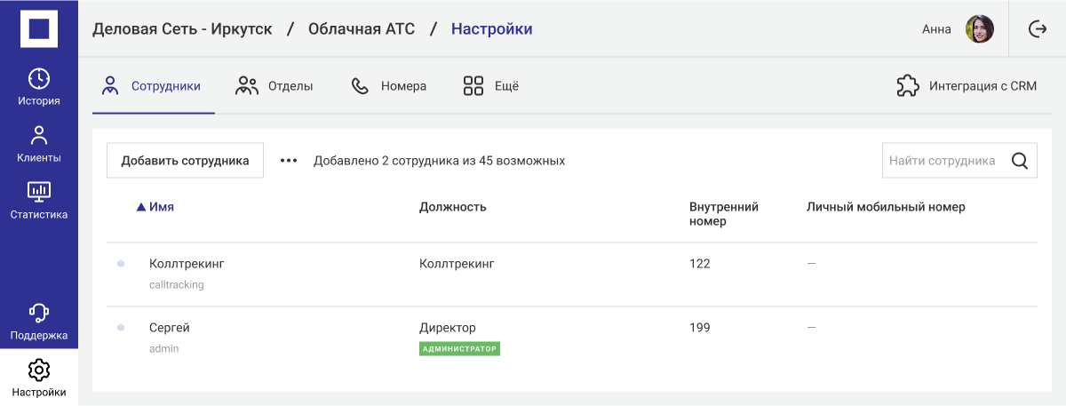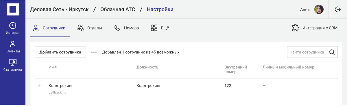 1. В АТС перейдите в раздел «Сотрудники» и добавьте нового сотрудника. Можно использовать существующего сотрудника. Рекомендуем в имени сотрудника использовать слово «Коллтрекинг», чтобы не путать его с реальными пользователями.