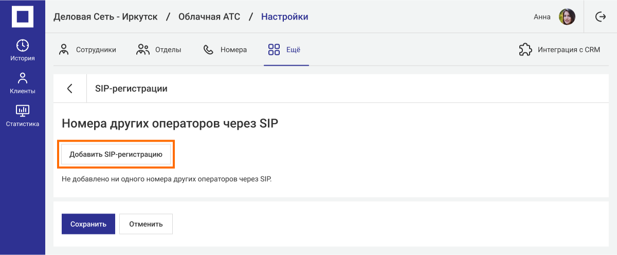 1. В кабинете АТС перейдите в раздел «Еще» — «Номера других операторов» — «SIP‑регистрации».