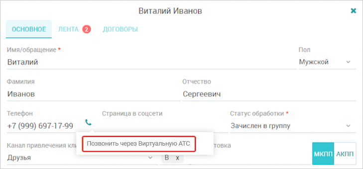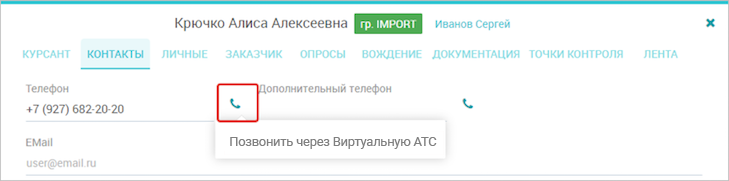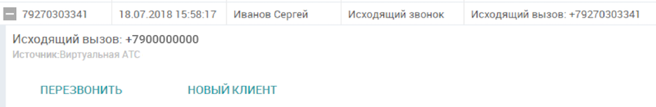 Прямо из карточке клиента вы сможете позвонить через АТС. Кнопка расположена справа от номера телефона: