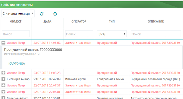 При активной интеграции Сервис периодически получает историю всех звонков. Задержка получения данных истории составляет от 2 до 4 минут. История звонков отражается в общей Ленте Автошколы (меню «Рабочий стол»).