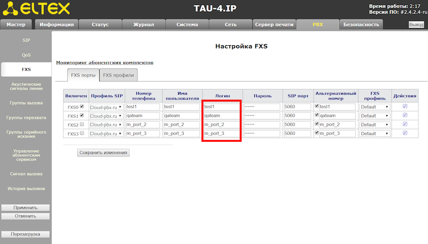 Вкладка «PBX – FXS – FXS порты – Включен FXS0 – Действия