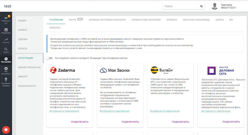 В личном кабинете АТС в разделе «Настройки» выберите «Интеграция с CRM». Внизу страницы для сервиса «Ваша CRM» нажмите «Подключить».