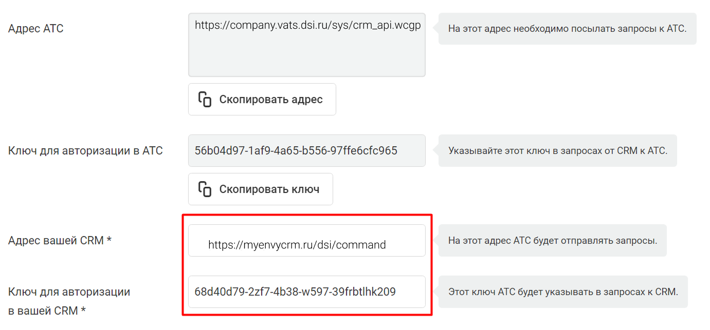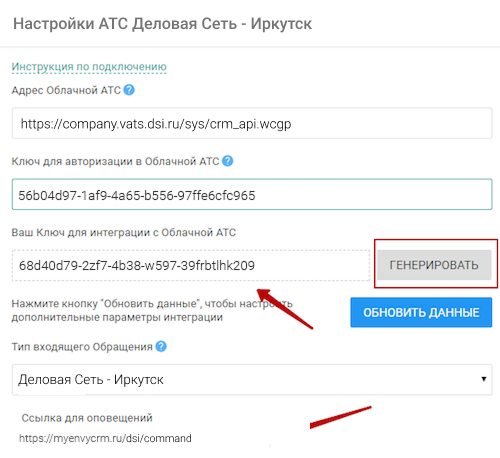 Далее в настройках CRM-системы нажмите «Генерировать», скопируйте сгенерированный ключ и вставьте его в поле «Ключ для авторизации в вашей CRM» в личном кабинете АТС.