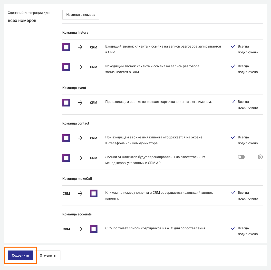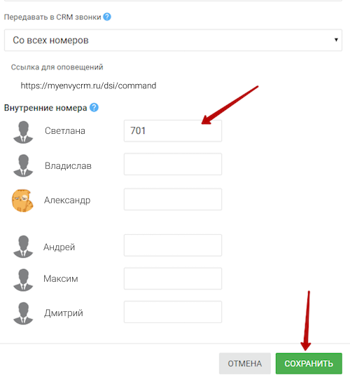 Вернитесь в настройки CRM-системы, укажите внутренние номера сотрудников и нажмите кнопку «Сохранить». На этом интеграция с АТС будет завершена.