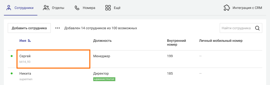 Назначить корпоративную SIM-карту сотруднику может только пользователь с уровнем прав «Администратор». После этого Корпоративная SIM-карта сразу станет персональным номером сотрудника в АТС.