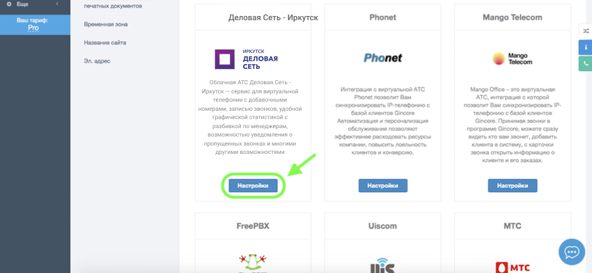 3. Зайдите в Gincore. Выберите «Еще» — «Настройки» — «Интеграция с телефонией». Нажмите кнопку «Настроить» на карточке АТС.