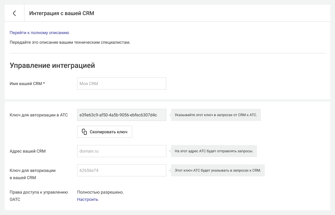 в технической поддержке kvartus.ru запросите значения полей «Адрес вашей CRM» и «Ключ для авторизации в вашей CRM». Вставьте их в личном кабинете АТС и нажмите «Сохранить».