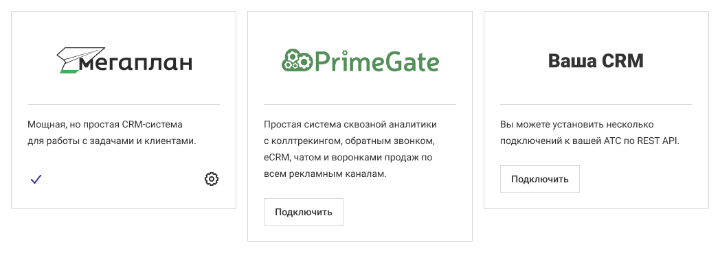 3. В интерфейсе АТС войдите в раздел «Интеграция с CRM», там показаны карточки CRM, интеграцию с которыми вы можете установить. Пролистните вниз и найдите карточку «Мегаплан».