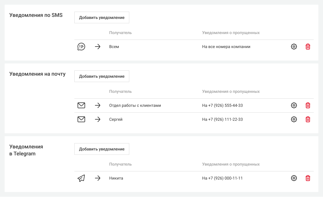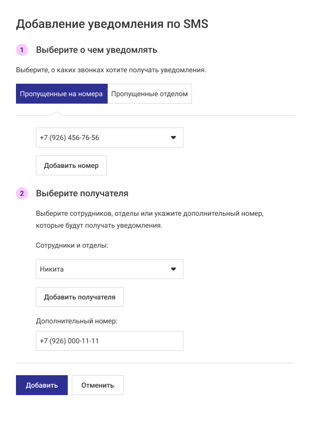 Для настройки уведомлений по e-mail и SMS достаточно либо указать сотрудника (у которого в профиле будет указан номер телефона и/или e-mail), либо указать произвольный телефон или e-mail.