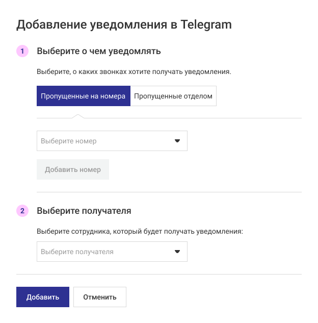 Для настройки уведомлений в мессенджер Telegram необходимо указать сотрудника, который будет получать уведомления.