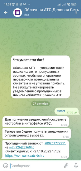 Рекомендуем для получения уведомлений использовать именно Telegram : он быстрее почты, не привязан к телефону и работает на любом устройстве (в том числе на компьютере).Так выглядит бот АТС в Telegram и первое уведомление в нем: