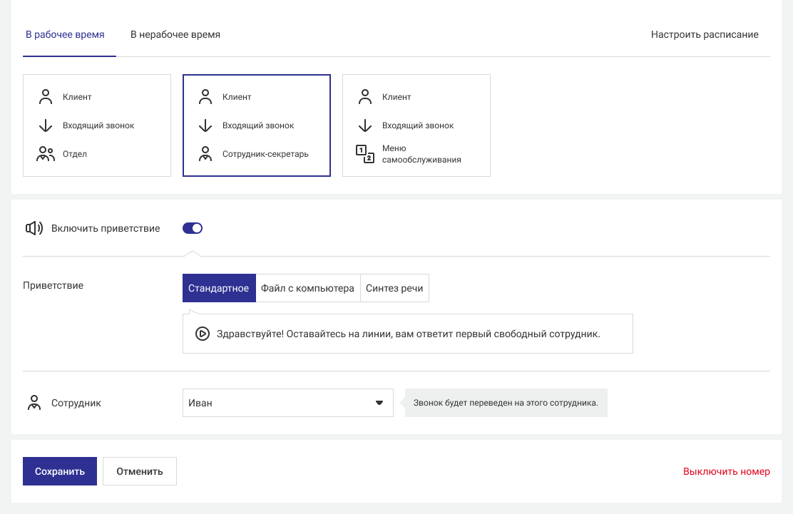 1. В настройках номера выберите режим работы «По расписанию» и перейдите на вкладку «В рабочее время». Выберите сценарий «Клиент – Входящий звонок – Сотрудник-секретарь».