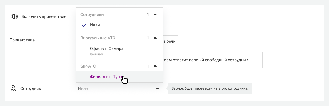 - Если это Виртуальная АТС, то выберите сотрудника в раскрывающемся списке.