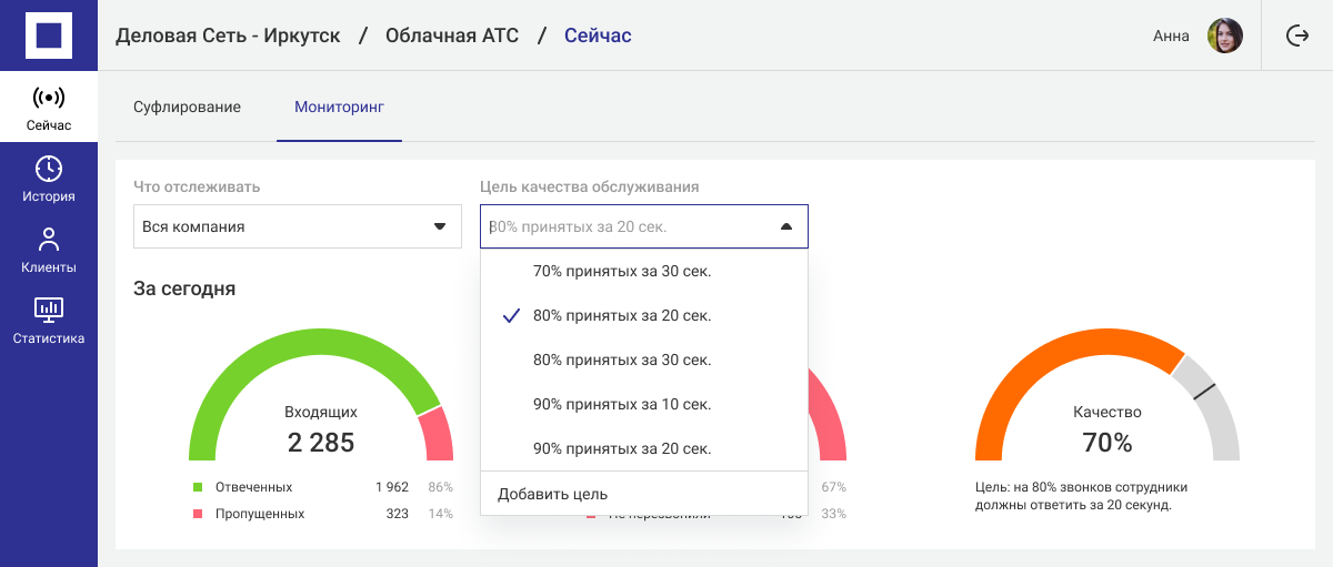 - Качество – доля входящих звонков, на которые сотрудники ответили в течение установленного времени (например, за 20 секунд).