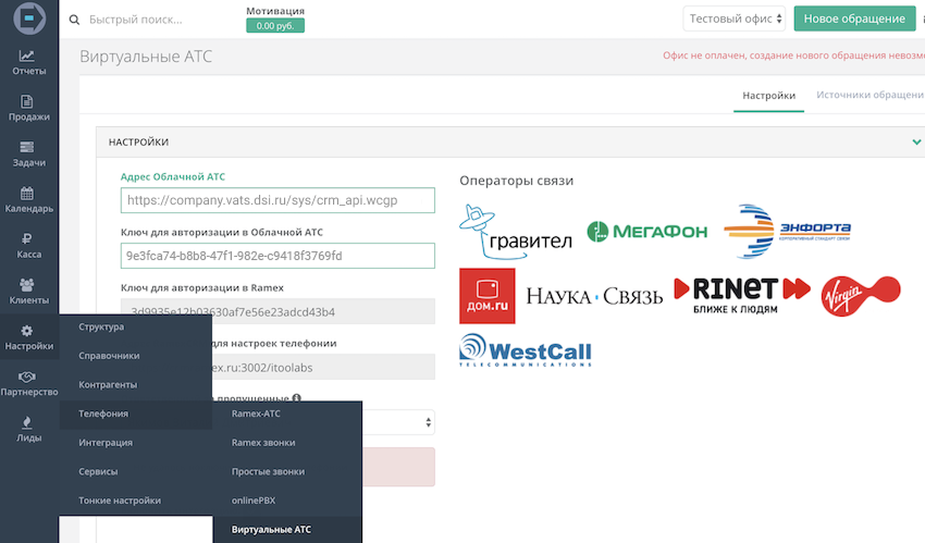 3. В личном кабинете Ramex перейдите в раздел “Настройки“ - “Телефония“ - “ АТС“.