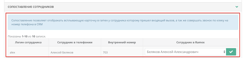 7. Необходимо сделать привязку пользователей АТС к пользователям Ramex. Для этого в селекторе “Сотрудник в Ramex“ выберите из списка необходимого сотрудника и нажмите на зеленую кнопку подтверждения.