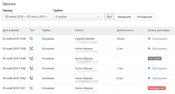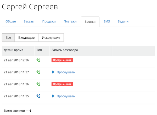 Чтобы посмотреть её, зайдите в карточку клиента и перейдите на вкладку “Звонки”. Здесь отобразятся все входящие, исходящие и пропущенные звонки по этому клиенту и записи разговоров.
