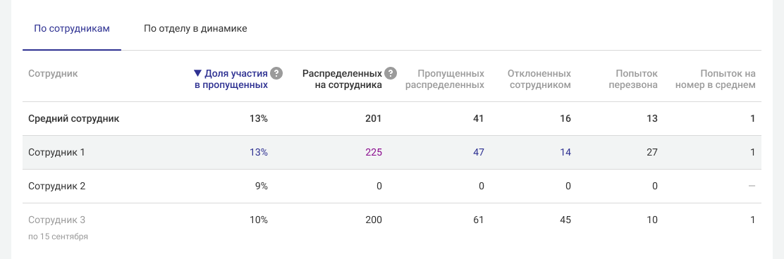 - Пропущенных звонков, распределенных на сотрудника — как часто сотрудник пропускает распределенные на него звонки. Возможно, доля участия в пропущенных отделом высокая, потому что таких звонков в целом немного, но при этом сотрудник редко пропускает звонки;