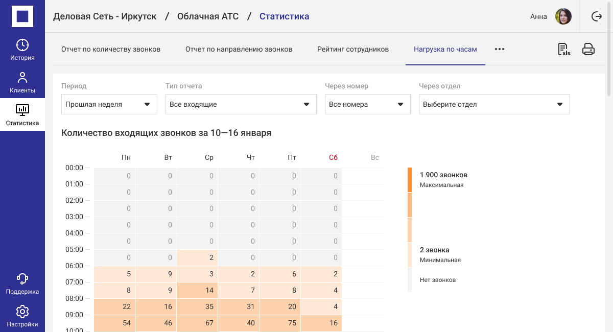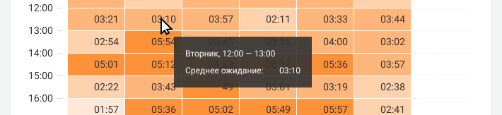 Отчет «Нагрузка по часам» показывает, в какое время и в какие дни недели сотрудники чаще и дольше всего общаются с клиентами.