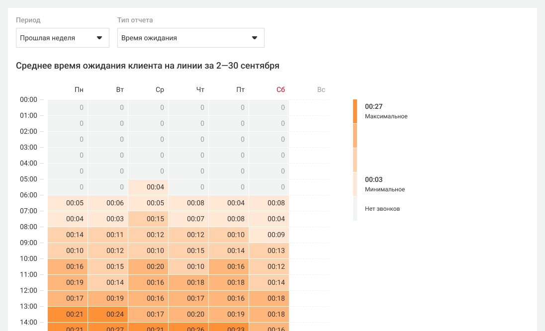 4. По времени ожидания вы поймете, сколько времени в среднем клиент ждал на линии. Ориентируясь на этот отчет, вы сможете менять маршруты звонков и расписание сотрудников так, чтобы среднее время ожидания стало меньше.