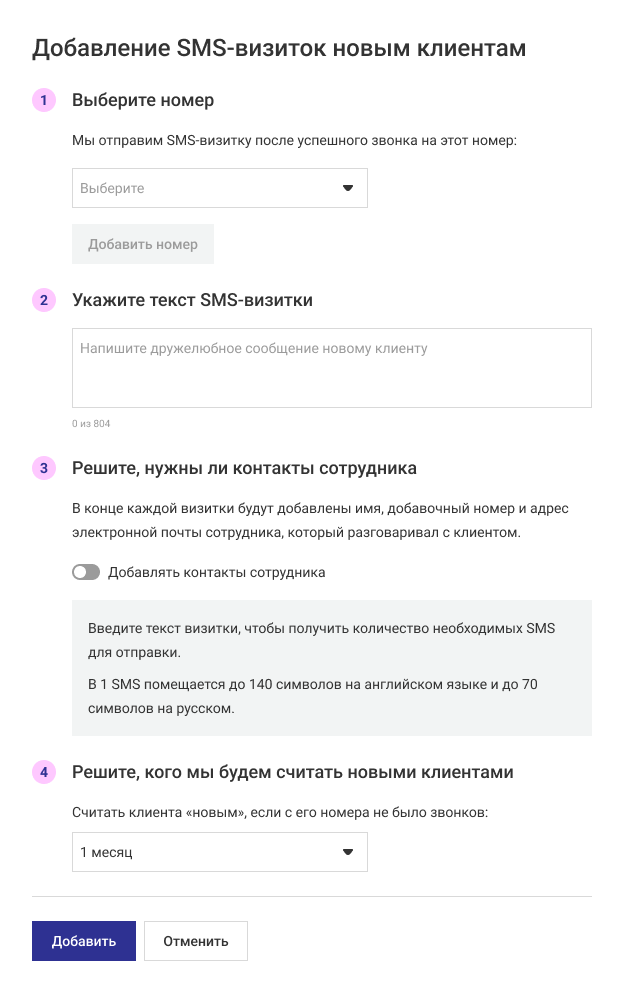 Настройте текст приветственной SMS. Также вы можете настроить, чтобы в SMS автоматически вставлялись контакты сотрудника, с которым говорил клиент (контакты берутся из данных о сотрудниках), настроить время, когда клиент считается новым, а также включить разные SMS-визитки для ваших номеров.