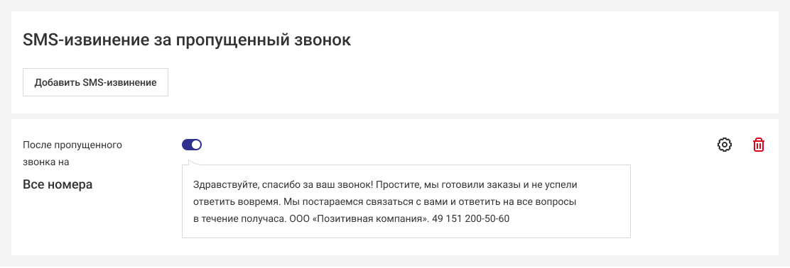 Клиент впервые звонит в вашу компанию и после разговора сразу же получает приветственное сообщение с контактами менеджера. Это позволит клиенту не потерять контакты вашей компании.