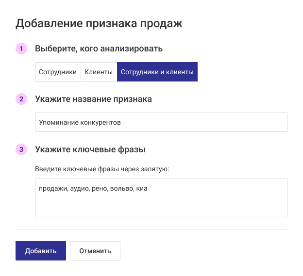 АТС будет распознавать добавленные слова и фразы только в разговорах, которые состоятся после того, как вы сохранили настройки. Уже состоявшиеся разговоры заново распознаваться не будут.3. Настройка признаков продаж