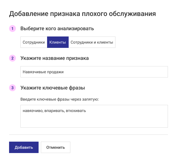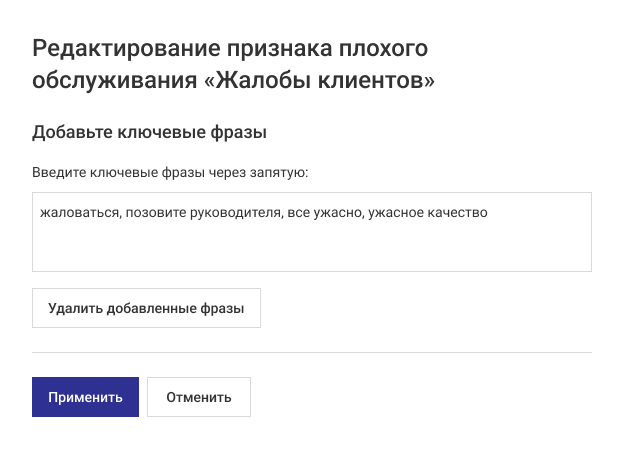 Вы можете использовать их либо добавить свои слова и фразы, которые встречались при плохом обслуживании в разговорах у ваших менеджеров. Чтобы добавить или отредактировать список, кликните на «шестеренку» напротив нужного признака.