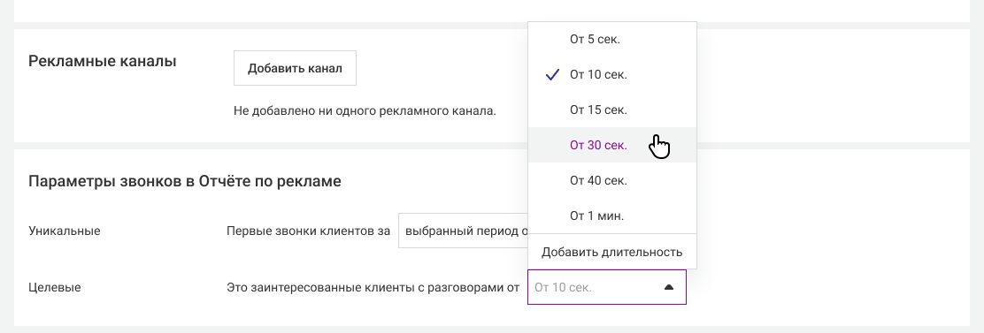 В блоке «Целевые звонки» выберите, звонки какой длительности стоит отслеживать в результатах рекламной кампании.