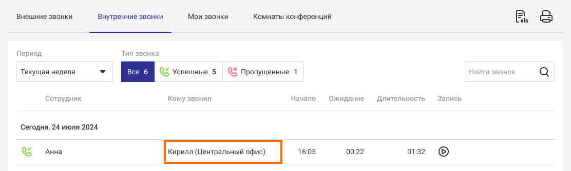 Все, теперь вы можете совершать и переводить звонки по коротким (внутренним) номерам между Облачными АТС. Такие вызовы будут отображаться в Истории на вкладке Внутренние вызовы, и их можно будет прослушать. В колонке «Кому звонил» в скобках будет указано название филиала, к которому относится менеджер.