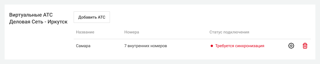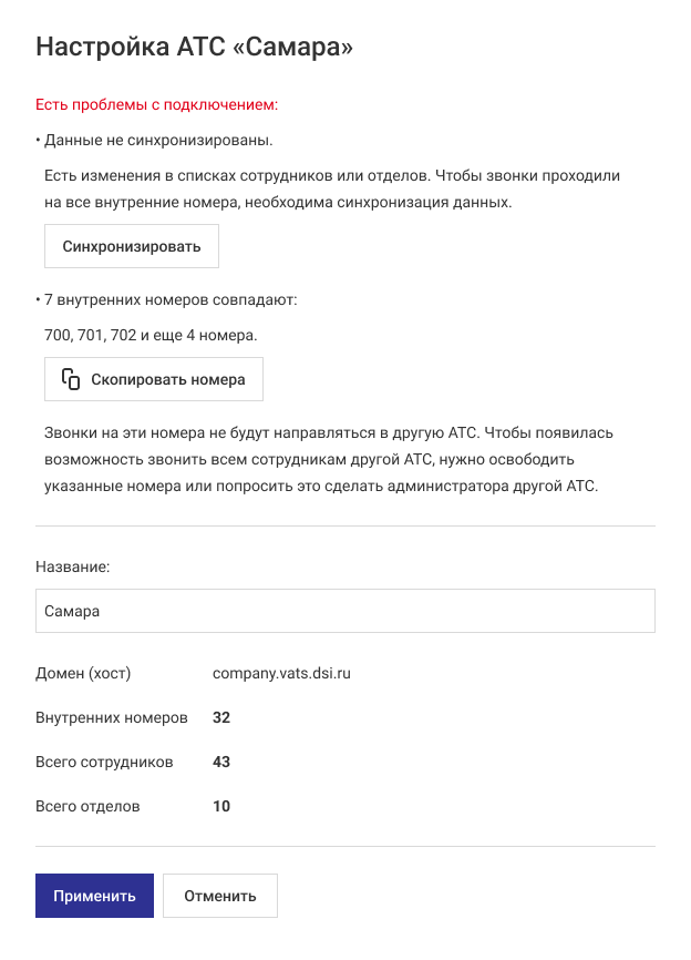 Если автосинхронизация не произошла, в настройках подключения к другой АТС появится кнопка «Синхронизировать». Нажмите ее, чтобы выполнить синхронизацию вручную.